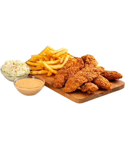 Marinated tenders with fries, onion rings or coleslaw.